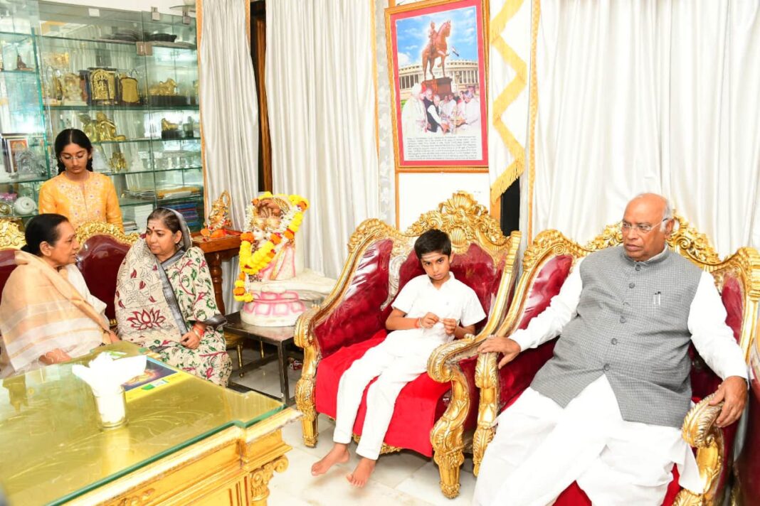 ಕಲಬುರಗಿ: ಇತ್ತೀಚಿಗೆ ಲಿಂಗೈಕ್ಯರಾದ ಶರಣಬಸವೇಶ್ವರ ಸಂಸ್ಥಾನದ 8ನೆಯ ಪೀಠಾಧಿಪತಿಗಳಾಗಿದ್ದ ಡಾ.ಪೂಜ್ಯ ಶ್ರೀ ಶರಣಬಸವಪ್ಪ ಅಪ್ಪಾಜೀ ಅವರ ಕುಟುಂಬ ವರ್ಗದವನ್ನು ಎಐಸಿಸಿ ಅಧ್ಯಕ್ಷರೂ ಆಗಿರುವ ರಾಜ್ಯಸಭೆ ವಿರೋಧ ಪಕ್ಷದ ನಾಯಕ ಡಾ.ಮಲ್ಲಿಕಾರ್ಜುನ ಖರ್ಗೆ ಅವರು ಭೇಟಿ ಮಾಡಿ ಸಾಂತ್ವನ ಹೇಳಿದರು.