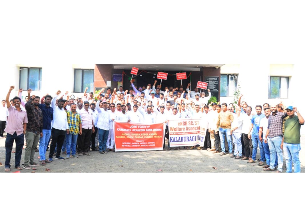 ಕಲಬುರಗಿ: 12ನೆಯ ದ್ವೀಪಕ್ಷಿಯ ವೇತನ ಒಪ್ಪಂದದಂತೆ ಬ್ಯಾಂಕುಗಳಲ್ಲಿ ವಾರಕ್ಕೆ 5 ದಿನದ ಕೆಲಸ ಜಾರಿಗೊಳಿಸಬೇಕು ಎಂದು ಆಗ್ರಹಿಸಿ, ಗ್ರಾಮೀಣ ಬ್ಯಾಂಕ್ ನೌಕರರ ಸಂಯುಕ್ತ ವೇದಿಕೆಯ ವತಿಯಿಂದ ಕರ್ನಾಟಕ ಗ್ರಾಮೀಣ ಬ್ಯಾಂಕ್ ಪ್ರಾದೇಶಿಕ ಕಚೇರಿ ಕುಸನೂರ ರಸ್ತೆ ಆವರಣದಲ್ಲಿ ಮುಷ್ಕರ ನಡೆಸಲಾಯಿತು.