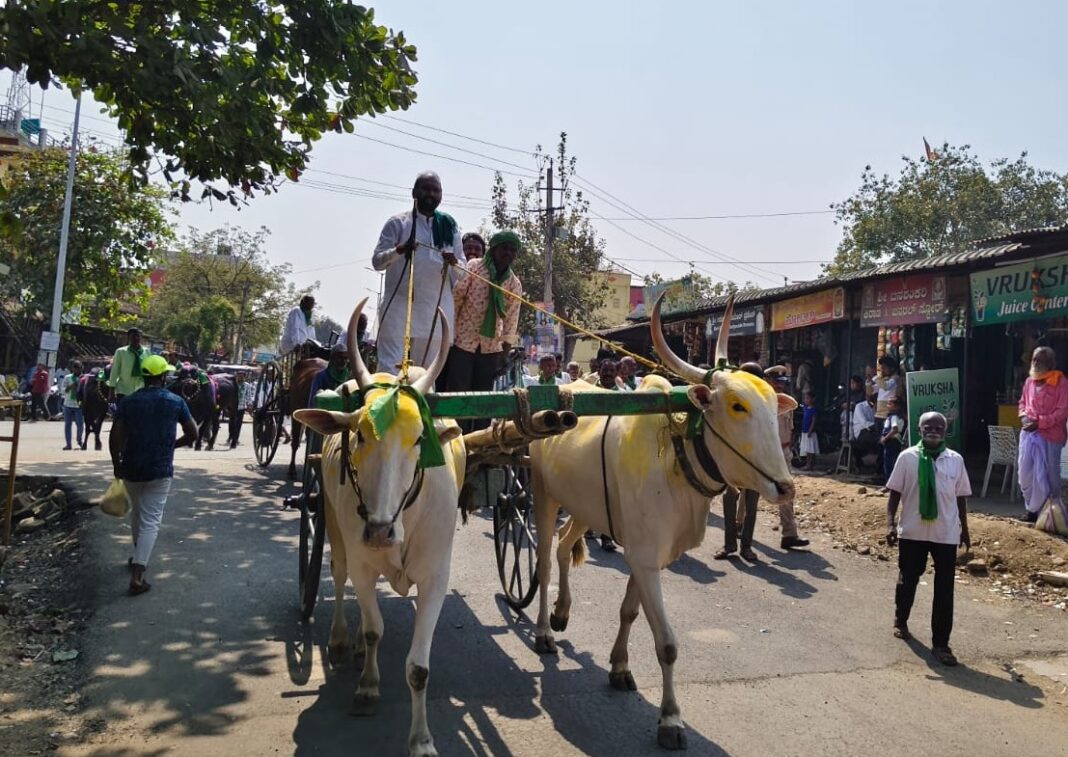 ಕಲಬುರಗಿ: ಕಾಳಗಿ ತಾಲೂಕಿನ ವಿವಿಧ ಗ್ರಾಮಗಳ ರೈತರಿಗೆ ಬೆಳೆ ವಿಮೆ ಹಾಗೂ ಬೆಳೆ ಪರಿಹಾರ ಹಣ ಮಂಜೂರು ಮಾಡುವಂತೆ ಆಗ್ರಹಿಸಿ ಹಾಗೂ ವಿವಿಧ ಬೇಡಿಕೆಗಳ ಈಡೇರಿಕೆಗೆ ಒತ್ತಾಯಿಸಿ ಕರ್ನಾಟಕ ರಾಜ್ಯ ರೈತ ಸಂಘ ಹಾಗೂ ರೈತ ಸೇನೆ, ವಿವಿಧ ಸಂಘಟನೆಗಳ ಮುಖಂಡರುಗಳ ನೇತೃತ್ವದಲ್ಲಿ ಕಾಳಗಿ ತಹಸೀಲ್ ಕಚೇರಿ ಮುಂದೆ ಮಂಗಳವಾರ ಎತ್ತಿನ ಬಂಡಿ ಹಾಗೂ ಟ್ರ್ಯಾಕ್ಟರ್ ಗಳೊಂದಿಗೆ ರೈತರು ಧರಣಿ ಸತ್ಯಾಗ್ರಹ ನಡೆಸಿದರು.